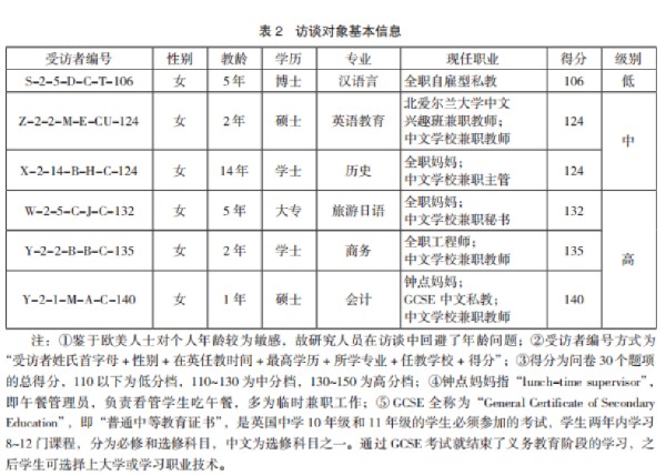 研究人員于2019年底至2020年初陸續對受訪者進行面對面訪談和微信語音訪談,重點了解英國華教工作者在六個維度上的感受,以及從教動機、對英國華文教育未來發展的看法、個人繼續從教意愿以及職業發展規劃等。每次訪談時間為45~90分鐘,訪談內容后被整理為3 萬多的文字資料。