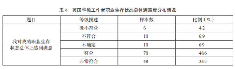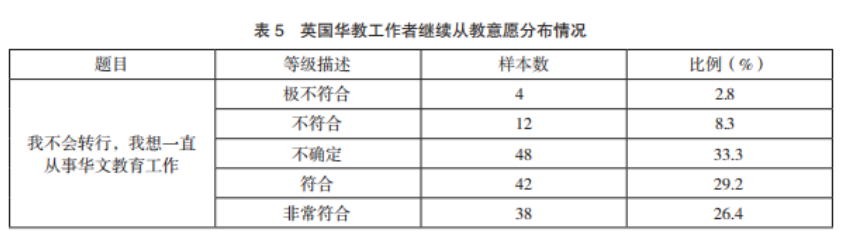 另一方面,華教工作者在英國教育場域處于一種非主流的邊緣化狀態,這又讓他們對自己的專業身份產生了懷疑和迷茫,臨時、過渡、非正式之感成為一種普遍感受,個別從業者對繼續從教持觀望心態。一位具有14年華文教齡、赴英前曾在中國某職校擔任多年講師的受訪者表達了對身份落差的深刻體會:“學生不認為我們是正規的老師,所以他們對我們沒有對老師應有的那種尊重,在他們眼里,英國學校的老師才是正規的老師。”其他受訪者也流露出相似的感受,認為由于華校是提供義務性的教育,“家長對我們沒有太高要求”,“只能作為臨時的工作”。微薄的收入、模糊的身份損傷了華教工作者的職業幸福感和職業滿意度,導致一部分人產生離職傾向,繼而影響華教師資隊伍的穩定。