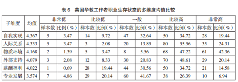 把各個題項分為六個維度進行統計整理,可以揭示華教工作者職業生存狀態的不同側面。如表6所示,調查對象職業生存狀態各維度均值由高到低依次是:自我實現>人際關系>物質環境>外部支持>薪酬福利>專業發展。其中,受訪者對“自我實現”滿意度最高,表明華文教育工作在很大程度上促進了受訪者自我價值的實現,其工作得到了學生、家長、家人、當地民眾的認可。相反,受訪者對“專業發展”的滿意度最低,說明他們接受再教育、再學習的意識強烈,但培訓進修、晉級升等的渠道有限,專業發展遭遇“天花板”。