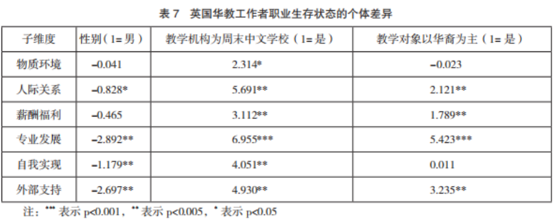 經過均值比較發現,英國華教工作者的職業生存狀態主要在性別、任教機構和教學對象等方面存在顯著性差異(P<0.05),如表7所示:第一,男性從業者各維度的職業生存狀態的得分均低于女性,且“人際關系”“專業發展”“自我實現”與“外部支持”子維度在性別方面差異顯著;第二,不同任教機構和教學對象的從業者存在顯著差異,就職于周末中文學校的從業者在各維度的職業生存狀態得分都高于在其他機構工作的同行;第三,以華裔學生 為主要教學對象的從業者在“人際關系”“薪酬福利”“專業發展”“外部支持”子維度的得分要明顯高于以非華裔為主要教學對象的從業者。