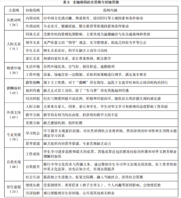 確定初始范疇之后,研究人員根據主軸編碼原則對21個初始范疇的相互關系和邏輯次序進行梳理,得出“從教動機”“人際關系”等8個主范疇,詳見表8,括號中為自由節點數。