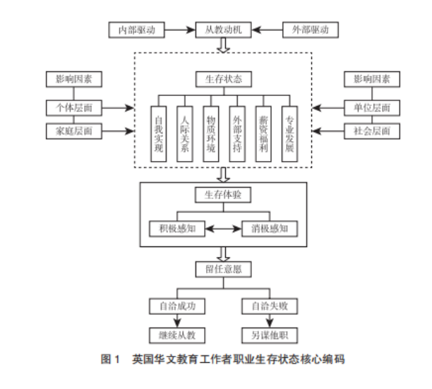 此“故事線”可以概括為:英國的華教工作者最初受到內部和外部的多種因素驅動決定從教,在他們進入華文教育職場后,來自個體、家庭、單位和社會四個層面的影響貫穿其職業生涯,決定著他們在華教職場的職業生存狀態,繼而影響其職業生存體驗,其中既有積極感知(如物質環境優渥、人際關系和諧、傳承中華文化的自豪感、學生進步的成就感等),也有消極感知(如待遇低下、身份模糊、前途迷茫等),并且兩種相互矛盾的感知一直處于此消彼長變動不居的狀態,當他們能夠邏輯自洽成功時,會選擇繼續從教,否則就可能會離開華教職場,另謀他職。