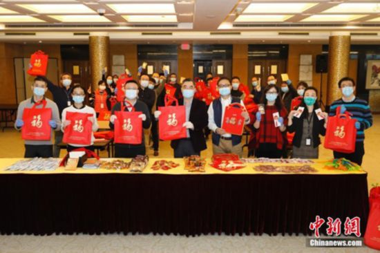 資料圖:中國駐紐約總領館向留學生、華僑發放“春節包”。