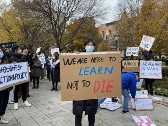 11月16日,以中國留學生為主的數百名芝加哥大學學生、教職員以及家長,在芝大校園舉行“我們要安全”游行集會,高呼“我們是來這里學習,不是來送死”“誰是下一個?”“停止槍支暴力”等口號,向校方強烈要求確保校園安全。