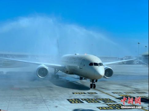 當地時間4月1日,馬來西亞重開邊界,允許完成疫苗接種者免隔離入境。圖為吉隆坡國際機場當天上午以水門迎接首個航班。中新社記者 陳悅 攝