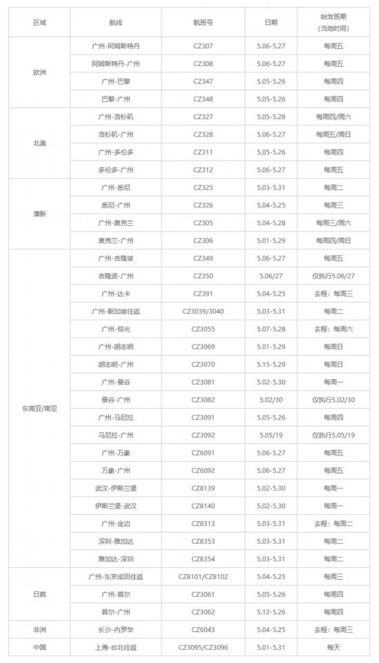 自5月1日起,南航本月可執行國際及地區航線共計21條,具體航班計劃如下: