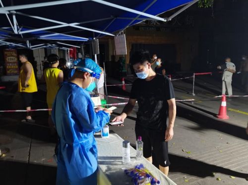 市僑聯工會主席李先貴在社區維護核酸檢測秩序