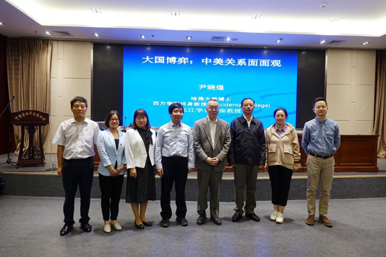尹教授在講座中分析了從1784到1785年間美國派出第一艘來華商船“中國皇后號”以來,近240年的中美關系發展史。尹教授強調,國家之間只有永恒的利益,沒有持久的敵人,中美兩國的交往即為例證。縱觀中美兩國交往歷史中幾個重要合作階段,均是緣于共同的利益:如二戰期間中美結為盟國,是因為抵抗日本侵略;50年前尼克松訪華,是因為反對蘇聯的霸權;2001年之后的合作,是因為反對恐怖主義對世界的威脅。中國作為世界上人口最多、面積最大的發展中國家,與美國作為世界上最發達的國家,相互間起到了經濟領域的互補,并無根本的利益沖突,因此,在若干個歷史發展的關鍵時刻,中美兩國才能夠合作共處,合作與競爭并存,合作多與競爭。當前,中美關系若要重回正軌,雙方必須重新建立共同利益,比如經濟領域的互補與合作仍可繼續,也有望成為這一合作的基點。