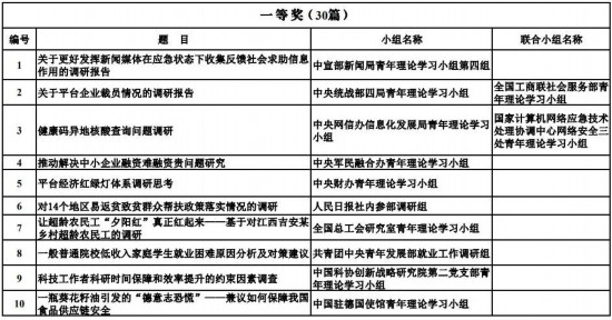 經各部門機關黨委推薦、有關科研機構復評和領導專家終評,最終評選產生了251篇優秀調研成果,其中特等獎10篇(并獲“十佳調研報告”稱號),一等獎30篇,二等獎60篇,三等獎151篇。獲獎名單如下: