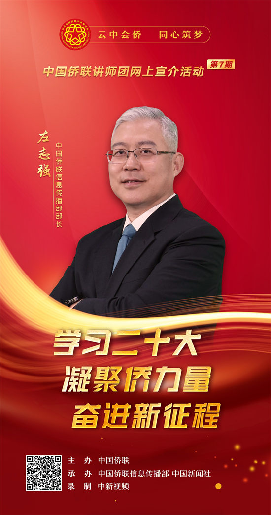 1月18日,以“學習二十大·凝聚僑力量·奮進新征程”為主題的中國僑聯講師團(第七期)網上宣介視頻正式上線。視頻旨在深入學習貫徹習近平新時代中國特色社會主義思想,深入學習宣傳貫徹黨的二十大精神,深刻領悟“兩個確立”的決定性意義,增強“四個意識”、堅定“四個自信”、做到“兩個維護”,進一步加深對習近平新時代中國特色社會主義思想的領悟,加強對馬克思主義中國化時代化、中國式現代化、全面從嚴治黨等重大問題的認識,深刻理解黨的二十大對全面建設社會主義現代化國家作出的戰略部署,在僑界興起學習宣傳貫徹熱潮,把思想統一到黨的二十大精神上來,把力量凝聚到黨的二十大確定的各項任務上來。