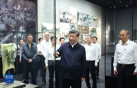 位于德陽市廣漢市西北鴨子河南岸的三星堆遺址,代表了數(shù)千年前的古蜀文明面貌和發(fā)展水平,是同時期長江流域文化內(nèi)涵最豐富、面積最大的都城遺址。26日下午,習近平來到三星堆博物館新館,參觀“世紀逐夢”、“巍然王都”、“天地人神”等展陳,了解三星堆遺址發(fā)掘歷程和古蜀文明成果。在三星堆博物館文物保護與修復館,習近平走進文保修復工作區(qū),仔細察看文物保護修復工作流程細節(jié)和最新技術,同現(xiàn)場工作人員親切交流。習近平指出,三星堆遺址考古成果在世界上是叫得響的,展現(xiàn)了四千多年前的文明成果,為中華文明多元一體、古蜀文明與中原文明相互影響等提供了更為有力的考古實證。文物保護修復是一項長期任務,要加大國家支持力度,加強人才隊伍建設,發(fā)揚嚴謹細致的工匠精神,一件一件來,久久為功,做出更大成績。習近平代表黨中央,對三星堆博物館新館的落成使用表示熱烈祝賀,向廣大考古工作者表示衷心感謝和崇高敬意!