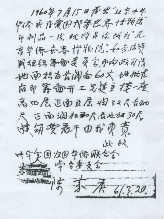 陳嘉庚致全國僑聯常務委員會關于籌建“北京華僑世界博物館”的函
