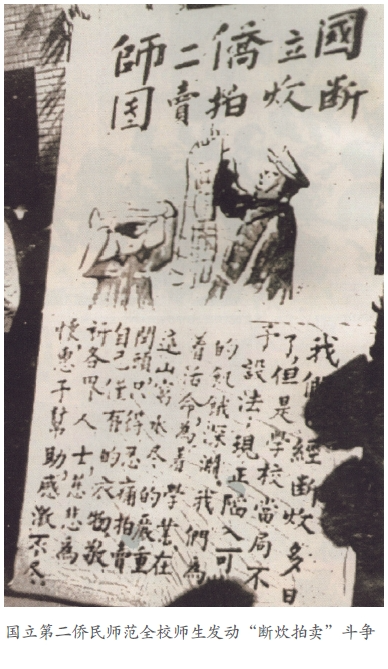 由于國民黨政府貪污腐敗,加上當時貨幣貶值、物價暴漲,1948年秋季僑二師出現了多次斷炊危機。在第四次斷炊時,校長和其他領導人甚至棄職逃走,讓學生自尋活路。為解燃眉之急,中共派廣州地下學聯到僑二師部署,組織全校師生發動“斷炊拍賣”斗爭。學生們將值錢的東西捐獻出來,掛在板車四周,高舉“國立僑二師斷炊拍賣團”“擦鞋隊”“賣花隊”的大牌和旗幟,浩浩蕩蕩奔赴漢民北路(現北京路)、惠愛中(現中山五路)、上九路、下九路和長堤等鬧市舉行拍賣活動。“斷炊拍賣”斗爭轟動一時,贏得社會各界廣泛的同情和支持。其間,廣雅、長風、美華、培道、知用、市二中、中大附中、海事等學校和單位派代表前來慰問和捐獻。僑一師也致電慰問。據不完全統計,學校收到金圓券2.8萬多元、港幣434元、白米6200斤。