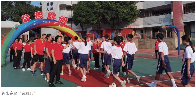 廣州市陳嘉庚紀念中學的開學典禮有一個傳統:新生入學都要穿過一道“誠毅門”。青春洋溢的少年們踩著紅毯,在分列于拱門兩旁的老師的歡迎下,有序地穿過“誠毅門”,成為一名嘉庚學子。開學的第一課則是“誠毅忠公”思想教育課。每屆新生入學,老師都安排這節課,向學生講述源于“嘉庚精神”的校訓——“誠毅忠公”的內涵:誠——誠實,誠以為國,誠信待人,實事求是;毅——堅毅,毅以處事,追求理想,艱苦奮斗;忠——愛國,忠于國家,心懷天下,關心民生;公——責任,大公無私,服務他人,奉獻社會。