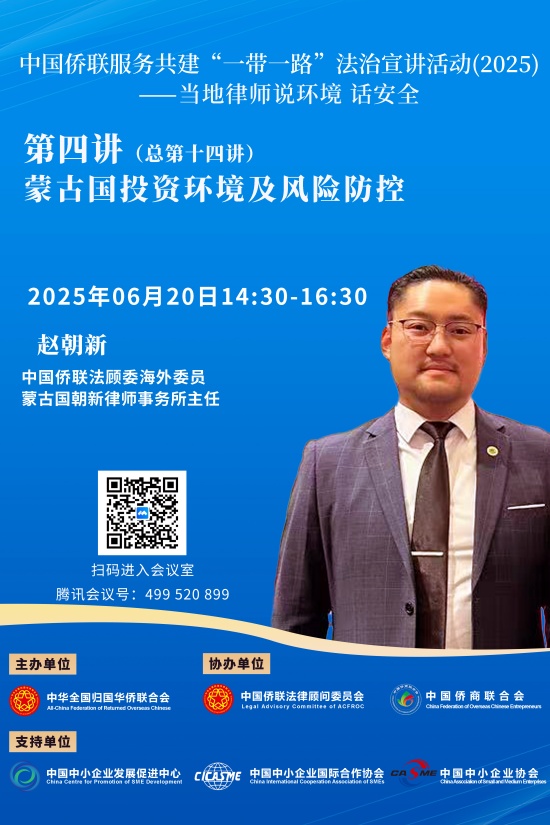 今年第四講(總第十四講)將于2025年6月20日(周五)14:30開(kāi)播,由中國(guó)僑聯(lián)法顧委海外委員蒙古國(guó)趙朝新律師主講。趙朝新律師1991年出生于蒙古國(guó)烏蘭巴托市,2013年畢業(yè)于中國(guó)暨南大學(xué)法學(xué)院,后在蒙古國(guó)國(guó)家行政管理學(xué)院進(jìn)修政府法務(wù)管理,是蒙古國(guó)目前唯一一位獲得律師資格證的中國(guó)公民。趙律師曾擔(dān)任蒙古國(guó)中國(guó)和平統(tǒng)一促進(jìn)會(huì)、蒙古國(guó)浙江商會(huì)和多家中資企業(yè)的法律顧問(wèn),2021年創(chuàng)立了蒙古國(guó)朝新律師事務(wù)所。該律所是蒙古國(guó)目前唯一一家由中國(guó)公民100%持股、具有從事蒙古國(guó)相關(guān)法律業(yè)務(wù)資格的本土律師事務(wù)所,為在蒙古國(guó)的中國(guó)公民和從事礦業(yè)、生產(chǎn)業(yè)、建筑業(yè)、銷售業(yè)、金融業(yè)等領(lǐng)域的中資企業(yè)提供專業(yè)、優(yōu)質(zhì)的法律服務(wù)。
