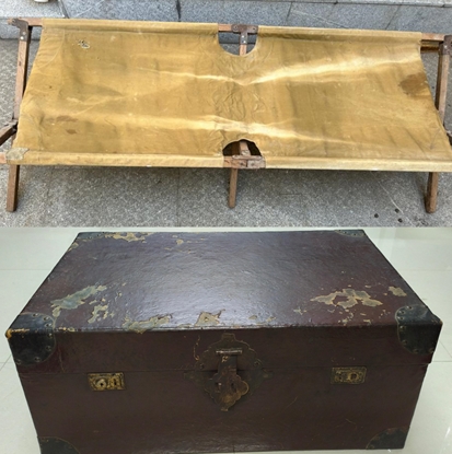 7月4日,在“螺旋槳切割云層的聲音——飛虎隊(duì)歷史記憶與和平守望特展”開(kāi)幕式上,南僑機(jī)工郭六成使用過(guò)的行軍床和皮箱入藏僑博,中國(guó)僑聯(lián)副主席程紅為郭六成之子郭振華和孫女郭文麗頒發(fā)捐贈(zèng)證書(shū)。據(jù)介紹,這張?zhí)厥獾男熊姶彩枪稍诘峋捁飞想S車攜帶的物品。平時(shí),它是機(jī)工們休息的床;不用時(shí),可折疊起來(lái)放在車上;情況緊急時(shí),還能變成簡(jiǎn)易擔(dān)架。床上洗不掉的血漬和斑痕,仿佛在訴說(shuō)著郭六成和機(jī)工們翻山越嶺、為保持運(yùn)輸大動(dòng)脈暢通而嘔心瀝血的過(guò)往。