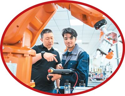 在天津現代職業技術學院魯班工坊實訓教室,教師指導學生操作設備。