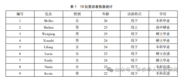 本研究采用深度訪談、個案研究和民族志方法,實施時間為2020—2024年。研究流程包括三個階段:一是通過深度訪談,與1.5代華人移民展開深入交流,并在訪談后保持聯系;二是通過個案研究,參與受訪者的日常生活,近距離觀察和分析其身份認同的流動性與文化適應;三是利用民族志的寫作形式,以深描(thick description)的方式展現1.5代移民的身份流變路徑與機制。