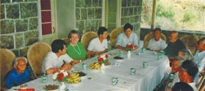 加德納夫人(前排右三)與人民日報記者柯月霖(前排左二)、吳綺敏(前排右二)、《啊,鼓嶺!》作者劉中漢(后排右三)在福建福州市鼓山風(fēng)景區(qū)“鼓頂”合影留念。